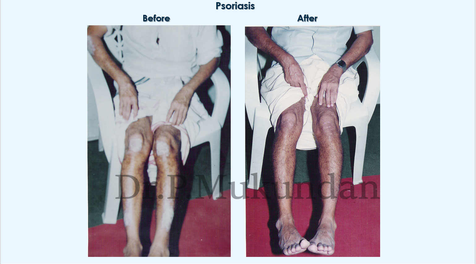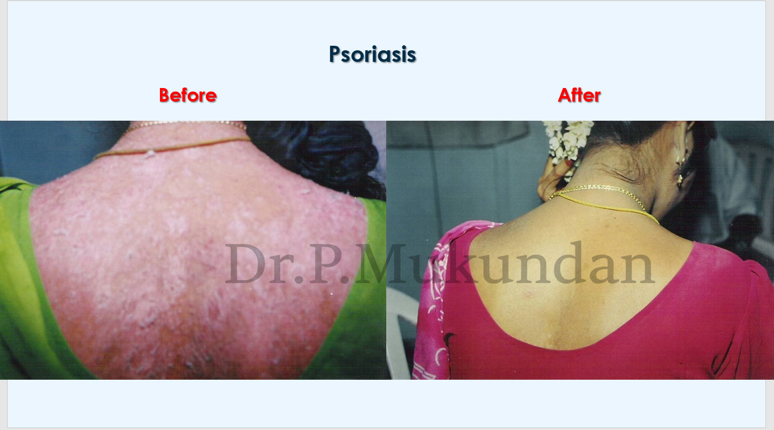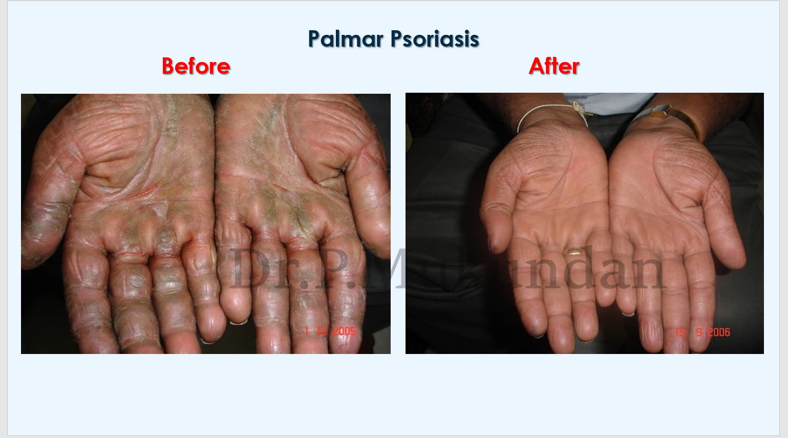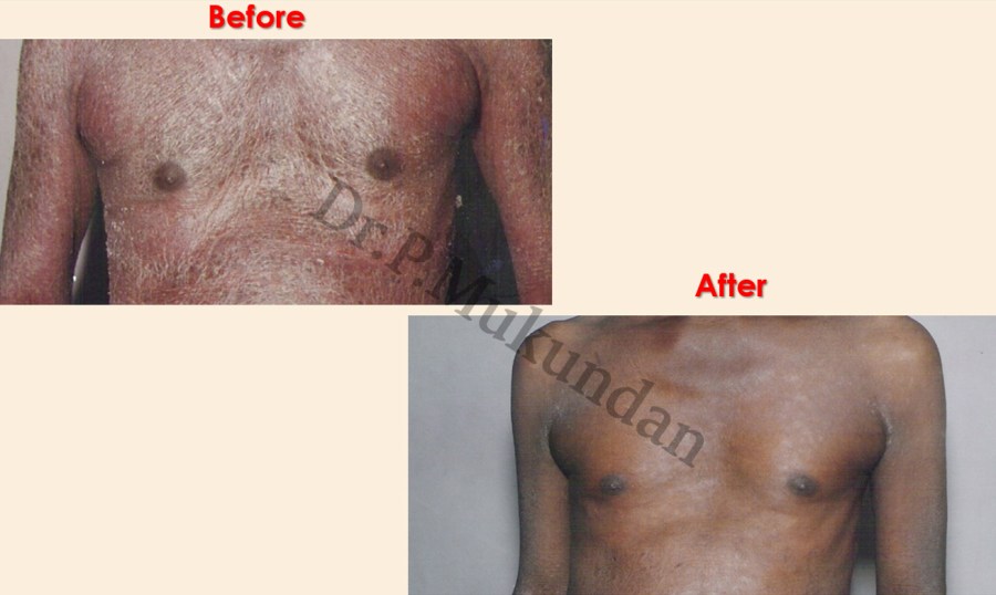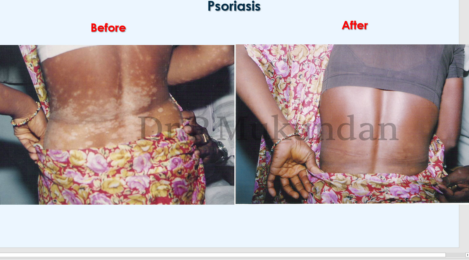 Homoeopathic constitutional medicine which helps to clear up the suppressions, the presenting symptoms from its root and the susceptibility for psoriasis or any other disease and thereby strengthening the constitution. Materia medica symptoms which exactly fit to the symptoms of the patient, cures such difficult cases permanently which are considered as incurable.